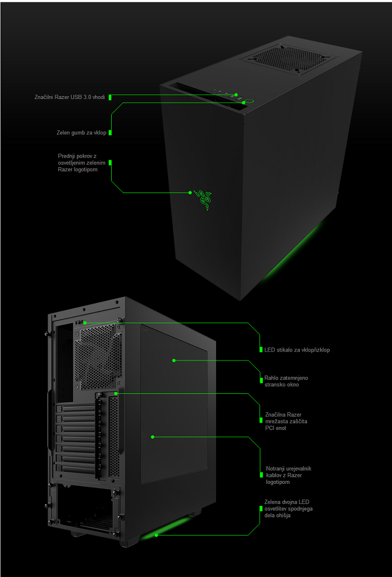 Popolnoma jekleno ohišje, ki obdaja popolnoma jekleno ogrodje. Vse narejeno z najvišjo stopnjo kvalitete, da zagotavlja uporabniku izkušnjo kot je še niste videli. Matirano črno ohišje z rahlimi zelenimi poudarki, gladke, jasne in urejene linije, brez nepotrebne navlake in veliko stransko okno dajejo ohišju neverjeten izgled.